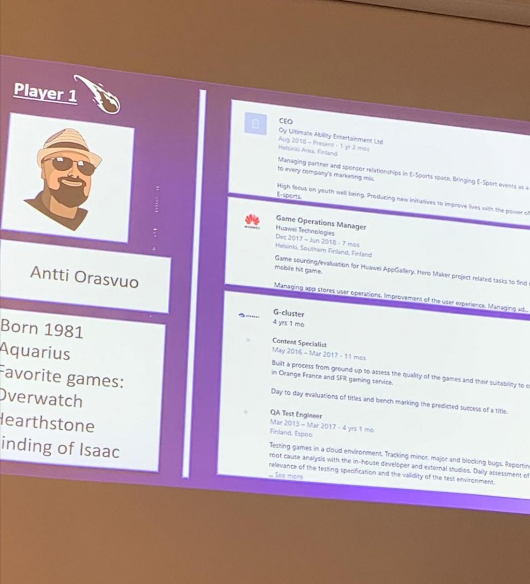 Ultimate Ability Entertaimentin CEO Antti Orasvuo kertoi meille alkuun hieman itsestään ja työhistoriastaan. Mieleenpainuvin tieto oli se, kun Antti kertoi olleensa neljä vuotta pelitestaajana ja pelanneensa tuossa ajassa läpi 108 peliä. Ihan mieletön määrä! Ajattelin välittömästi, että nörtit rules! Siis oikeesti, massia pelaamalla!