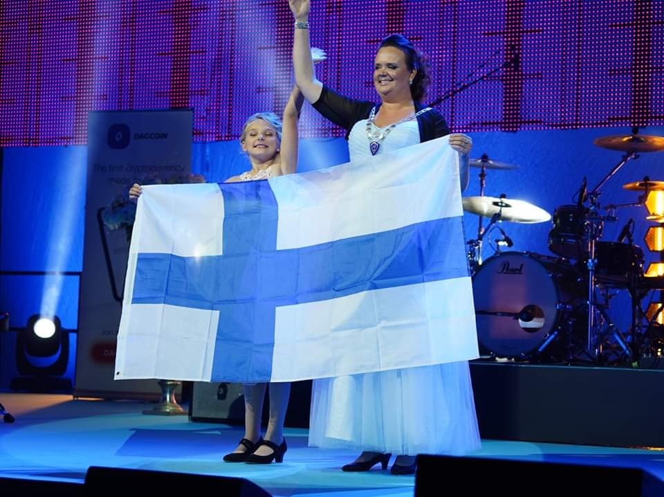 Tulojuhlan lavalle kutsuttiin jokaisen maan kansallinen puheenjohtaja. Suomea oli edustamassa meidän oma Ellimaija Ahonen tyttärensä kanssa. Suomen liput liehui ja meteli on kyllä korvia huumaava! Aika mieletön tunnelma!