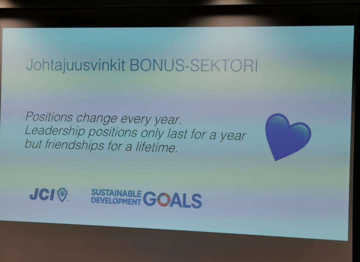 Johtajuusakatemian gaalassa koettiin varmasti voimakkaita tunteita, kun tulevat puheenjohtajat pääsivät ensimmäistä kertaa edustamaan omaa kamariaan. Kotkan Nuorkauppakamarissa puheenjohtajan käädyt vaihtuvat perinteen mukaan ”lopullisesti” uudelle puheenjohtajalle vasta vuosijuhlassa, eli Kuusenkaristajaisissa, joita vietetään heti tammikuun alussa. Mutta jo nyt Johtajuusakatemiassa Noora pääsi kokeilemaan, miltä vastuu harteilla tuntuu.
