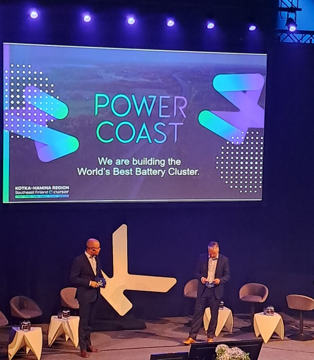 Seuraavana lavan ottivat haltuun Cursorin Jukka Tani ja Jarkko Harjula, jotka esittelivät Power Coast -hankkeen seudullemme tuomia mahdollisuuksia. Suunnitteilla olevat miljardihankkeet voivat tuoda seudulle tuhansia työpaikkoja ja uusiakin keskusteluja käydään koko ajan, sillä kiinnostusta Kymenlaaksoon investointikohteena on. Akkuteollisuuden lisäksi myös vetyteollisuuden parissa on paljon mahdollisuuksia. Alueemme kilpailukykytekijöitä ovat mm. teollinen historia ja infra, logistiikka kuten Satama, koulutus, edullinen ja varma energia ja eri sidosryhmien vahva yhteinen tahtotila.